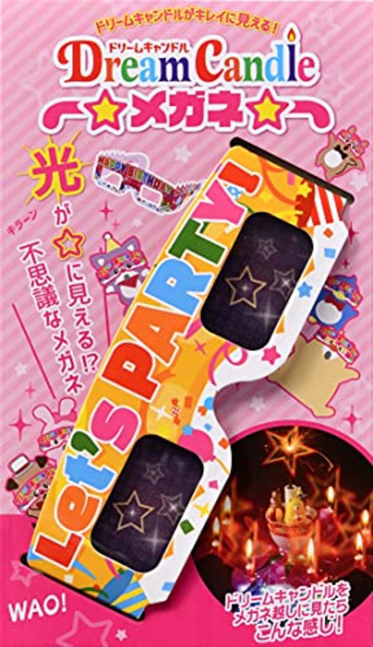 【ドリームキャンドル メガネ】をかけてドリームキャンドルを見ると花火の閃光やロウソクの輝きが星型に見える不思議なメガネです。デザインはバースデイ/パーティー/クリスマスの3種類より使うシーンによってお選びいただけます。ドリームキャンドル以外にもバースデーケーキなどのロウソクやクリスマスツリーのイルミネーションなどにもご使用いただけます。《蛍光灯などの柔らかな光には反応いたしませんのでご注意ください。》
